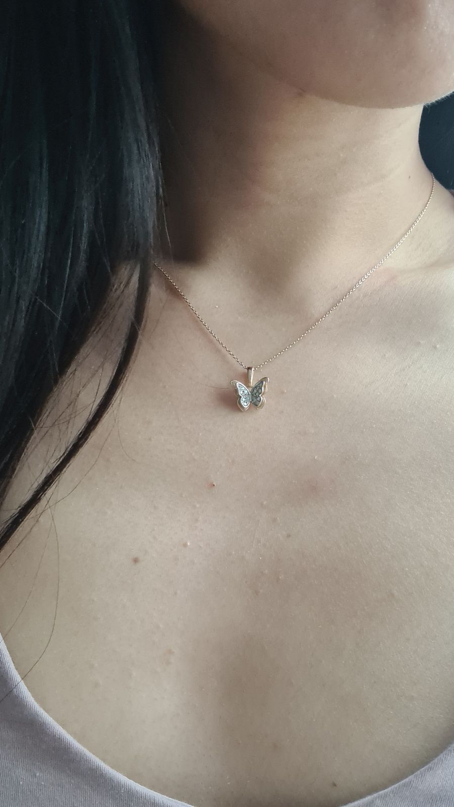 This charming pendant is sure to delight. Crafted in 10K white and rose gold, this lovely butterfly sparkles with 18 round brilliant diamonds for a total diamond weight of 0.13 carats. A matching chain is included.