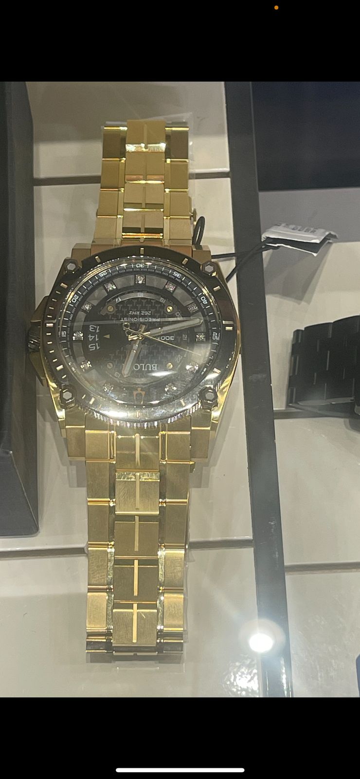 Powered by Bulova’s proprietary Precisionist three-hand calendar movement with a 262kHz vibrational frequency—eight times greater than standard timepieces—for unparalleled accuracy. Gold-tone stainless steel case with black dial featuring 11 hand set diamonds, curved mineral crystal, gold-tone stainless steel bracelet with sport fold over buckle. 300-meter water resistance.