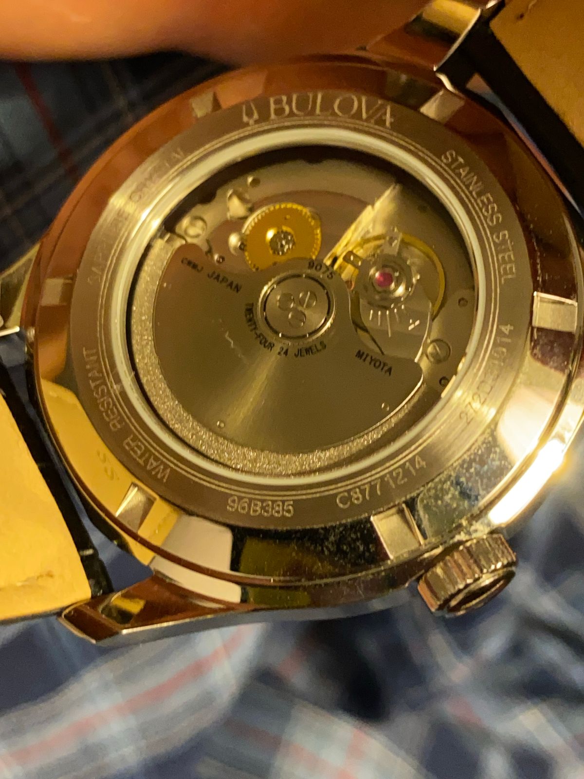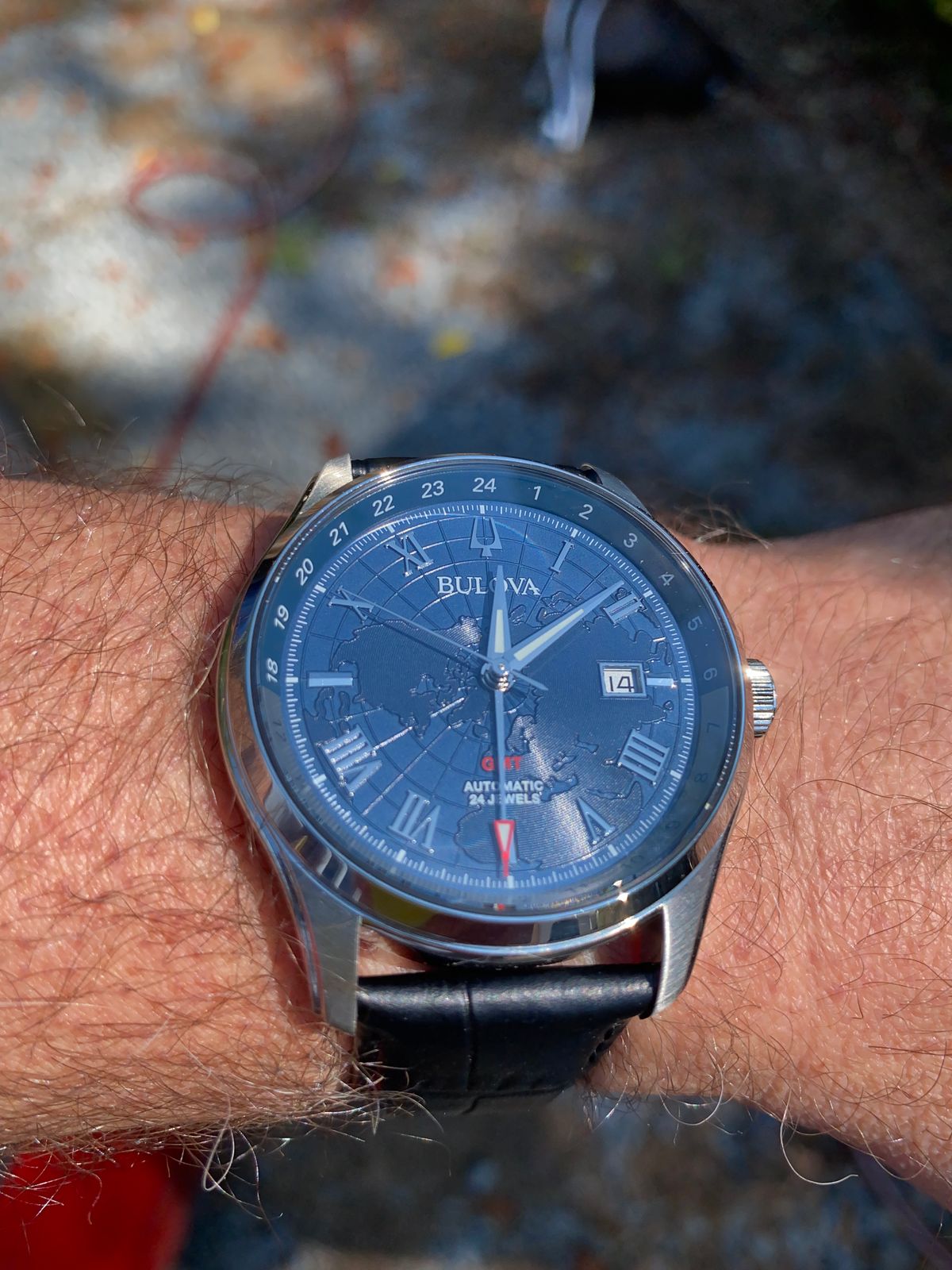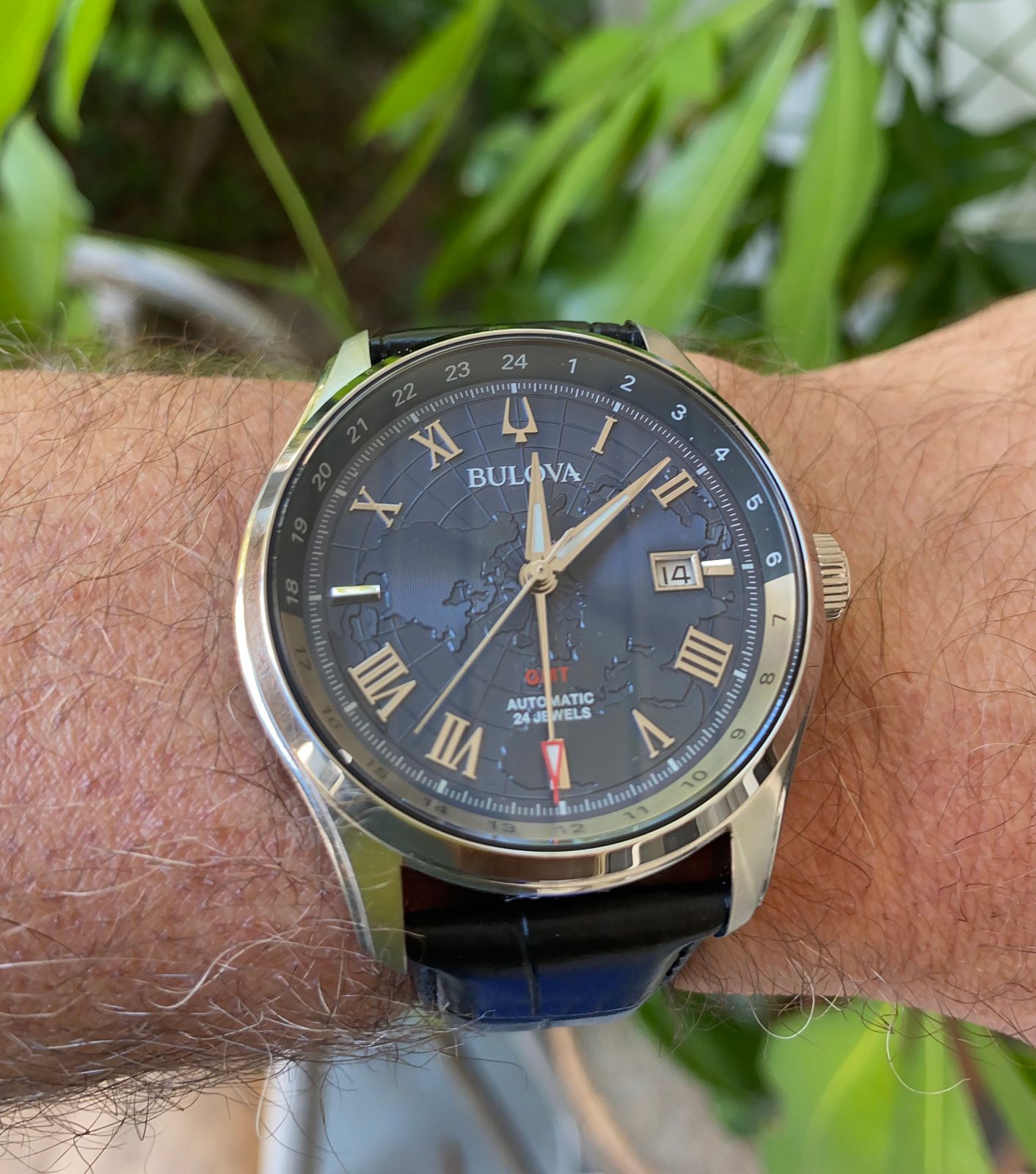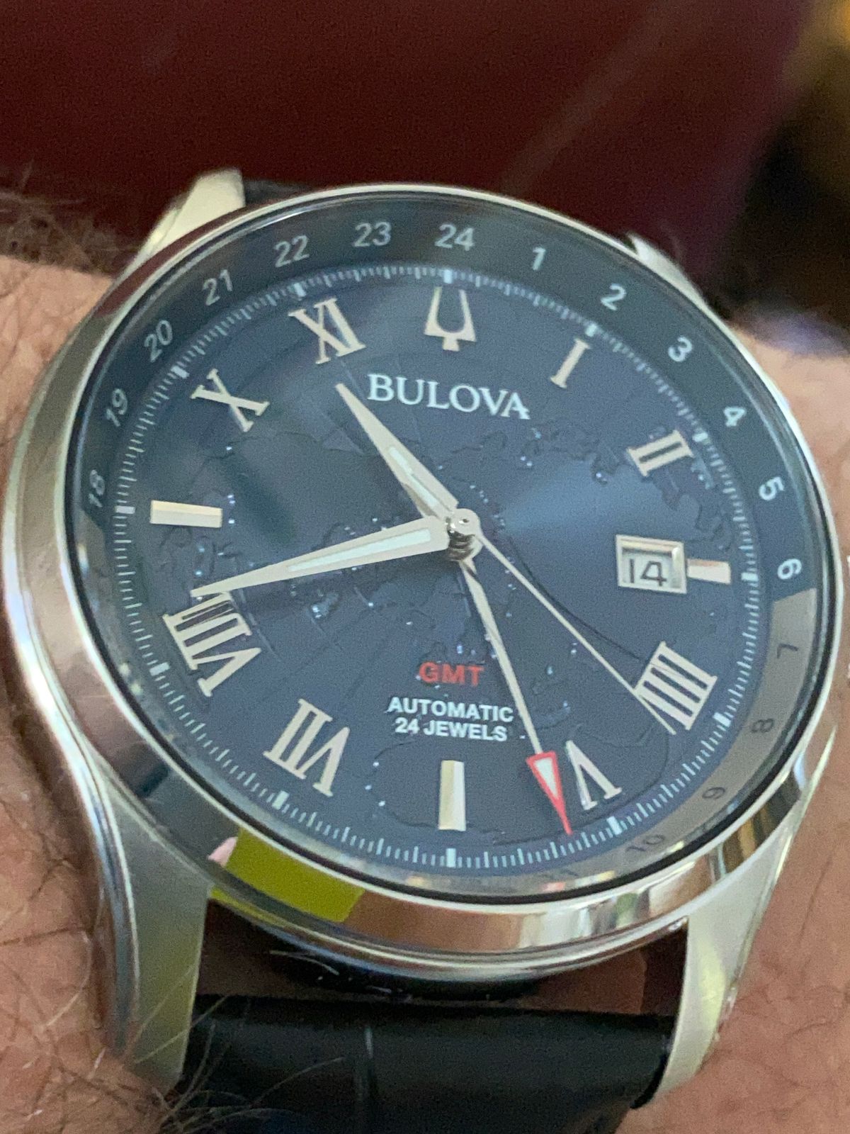 Timeless elegance is effortlessly combined with advanced GMT function in the luxurious, new Wilton Automatic timepiece from the Bulova Classic collection. This traditionally styled watch features an innovative, new automatic movement with the ease of setting the hour hand to another time zone without affecting the accuracy while traveling anywhere in the world – and the dual time can be read at glance. The sophisticated design of the silver-tone stainless steel case showcases a blue 4-hand GMT dial with a calendar, Roman numeral markers, and an antireflective, domed sapphire crystal. The GMT hand’s luminous tip is bordered in a tone to match the colour of the “GMT” printed on the dial and works with the bi-coloured dial ring with a 24- hour indication to mark the 2nd time zone. The dial features a World Map with the land area raised in a cd groove texture with latitude and longitude coordinates also raised over the sea. The black embossed alligator leather strap with tone-on-tone stitching, nubuck lining and double-press deployant buckle closure completes the richly elegant feel. This watch’s selfwinding 24 jewel automatic movement ensures optimal performance and features a 42-hour power reserve making it the ultimate timepiece for world travelers and fine watch enthusiasts alike. Water resistant to 30 metres.