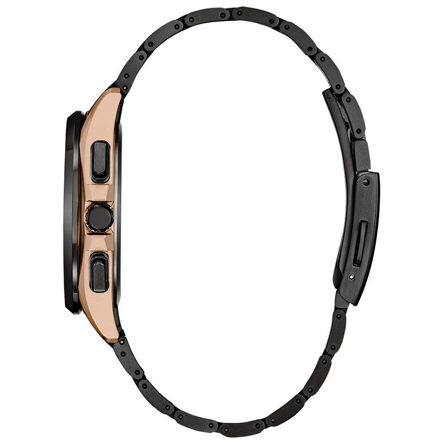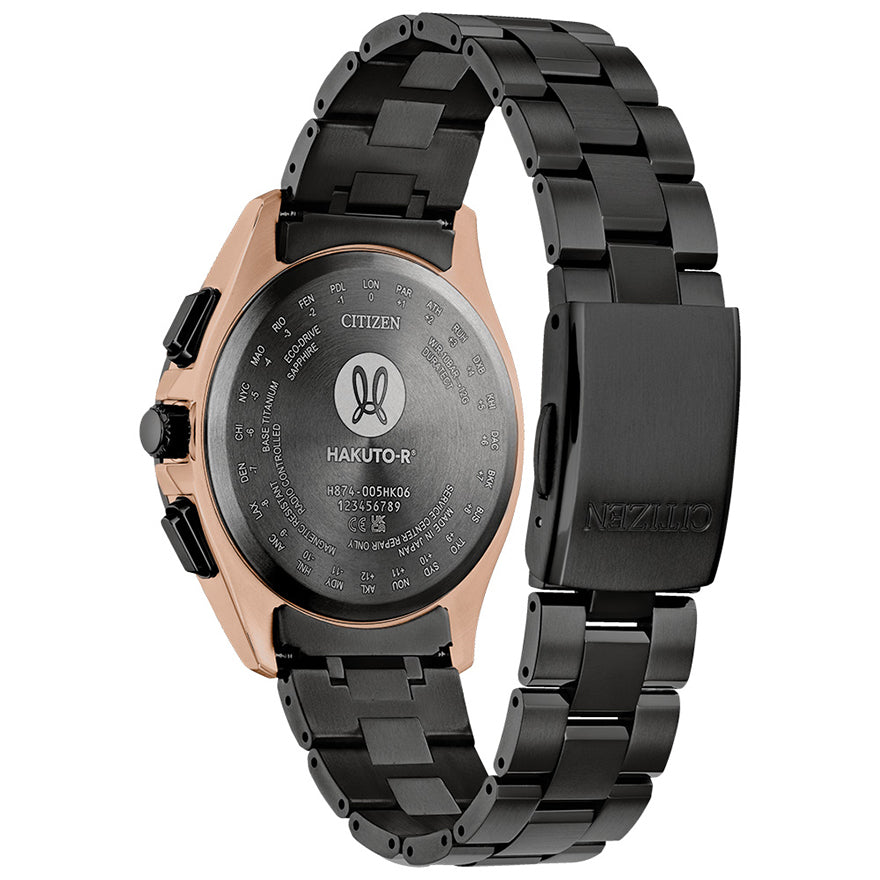 A naturally forward-looking and starry-eyed collection, since its 1987 launch the Attesa has delivered dependable performance via expert titanium-processing know-how and innovative technology. In this timepiece, the Attesa H874, you find just that – the world’s first fully automatic analog moon phase function for light-powered analog wristwatches, combined with Atomic Timekeeping with world time in 26 time zones, a perpetual calendar with day and date indicators, 12/24-hour timekeeping, and a power reserve display.A 41.5mm Super Titanium™ case makes use of rose gold tones and gray DLC to anchor the design, while a matching bracelet expands upon the style and secures the watch to the wrist. A fine mix of polished and brushed surfaces adds dynamism to the modern style. Beneath a sapphire crystal, a lunar-inspired background plays host to a vertical-configured chronograph display, with a 6 o'clock moonphase and a 4 o'clock date window balancing technological utility with intrigue for the eye. Powered by Citizen’s famed Eco-Drive technology to provide light-powered vitality without ever needing a battery, the watch makes use of Citizen's proprietary new Luna Program– the world’s first fully automatic analog moon phase function for light-powered analog wristwatches. Water resistant up to 100 meters. Caliber H874.Limited to 2,100 pieces worldwide.