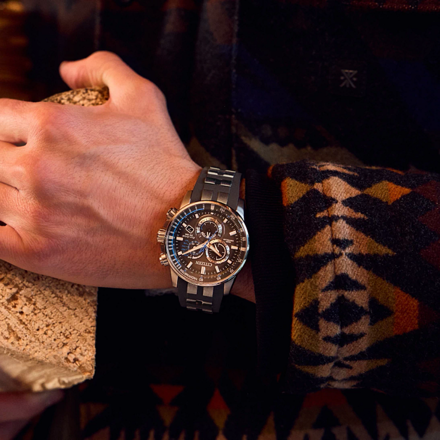 The limited-edition PCAT Sport is an even more modern, action-ready take on a classic aviation-inspired design. Bold from first glance, thanks to its 43mm silver-tone stainless steel case, screw-down pushers, and a guard-flanked crown provide durable prominence in wear, while a durable stainless steel and polyurethane strap secures the watch to the wrist. On the dial, the timepiece’s many mission-ready features are displayed, including a tachymetric bezel, world timer, perpetual calendar, power reserve indicator, chronograph, and atomic timekeeping with synchronized time adjustment in 43 cities worldwide and radio control. Sustainably powered by light and never needs a battery change with Eco-Drive technology. Water resistant up to 200 meters. Caliber E660. Limited to 1,500 unnumbered pieces worldwide.