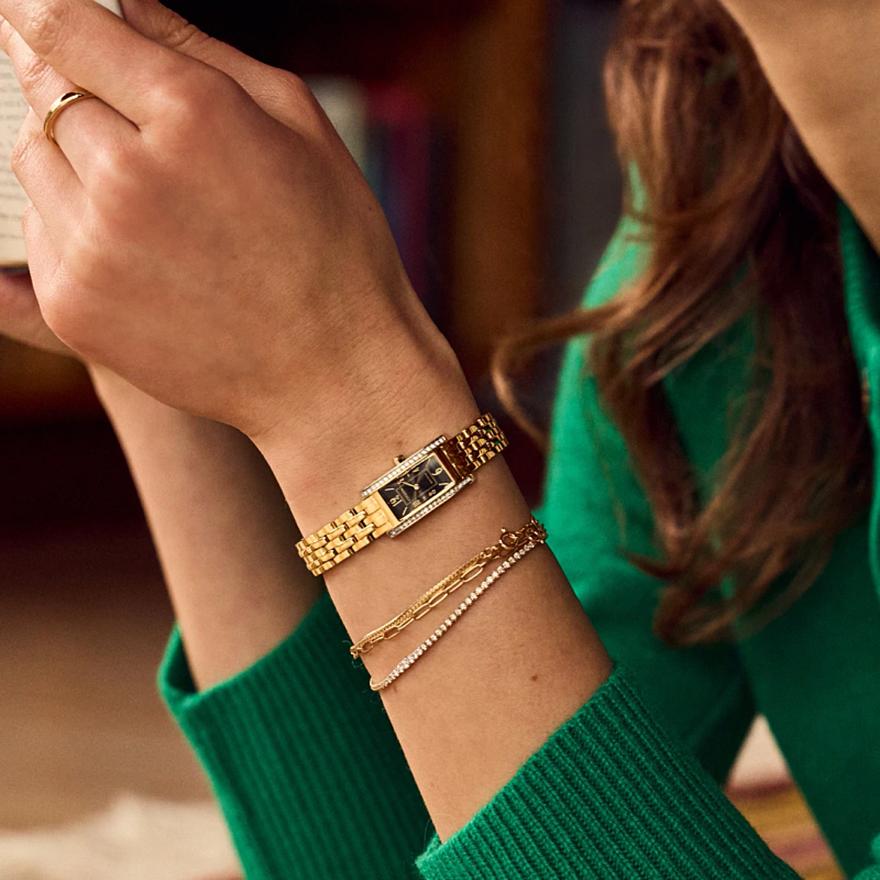 Inspired by the elegant, elongated shape of the original, the Petite Palidoro reissue is the latest women’s watch in our Dress Classic collection and is the perfect complement for elegant wear. On the wrist, the timepiece measures 28mm in gold-tone stainless steel, with its rectangular form accented by crystals on either side of the bezel and a lovely geometric crown. A matching five-link bracelet effortlessly secures the watch to the wrist. The black dial is as much an exercise in sophisticated art deco as the case, with stylized Arabic numerals being framed in creative fashion while shortened hour and minute hands indicate the time. Sustainably powered by any light with our proprietary Eco-Drive technology that never needs a battery, this elegant ladies’ watch is the perfect addition to any look. Caliber G620.