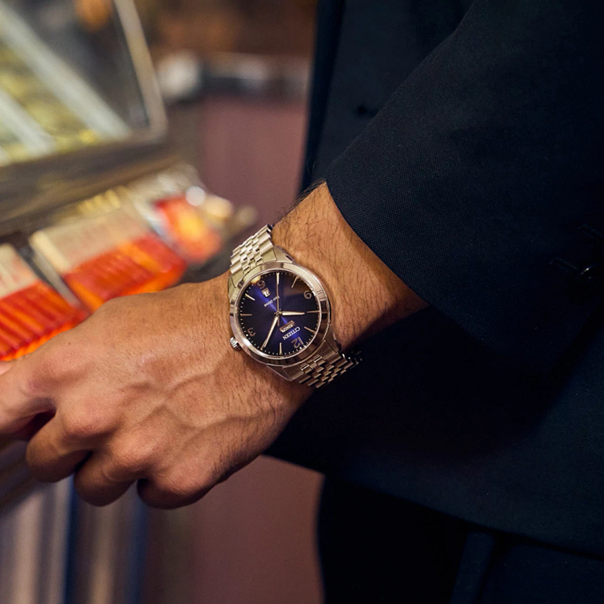 This vintage-inspired timepiece is a paragon of timeless elegance. With a 40.5mm, silver-tone stainless steel case and matching five-link bracelet, the new Rolan features a blue dial with a gradient effect. Applied silver-tone accents and Arabic numerals at the quarter hours add to its charm, while day and date indicators on opposite sides of the top and bottom of the dial place the watch firmly in the realm of retro-style. The watch features Citizen's Eco-Drive technology – sustainably powered by light, any light, and never needs a battery. Water resistant to 100 meters. Caliber J800.