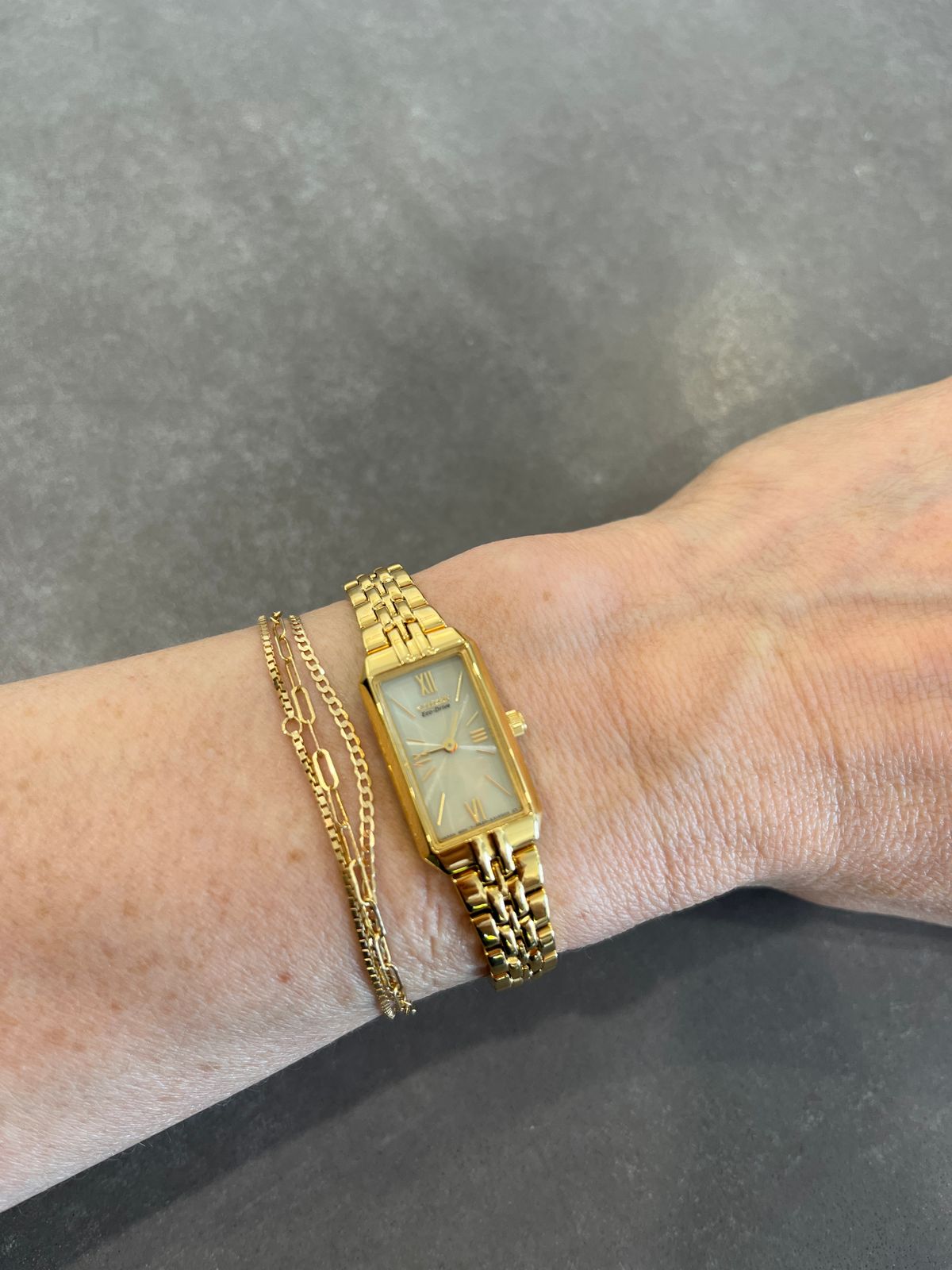 Perfectly complete any look with the elegance of this Citizen Eco-Drive Ladies' Classic. Featuring a 30.5 x 14.5mm rectangular gold-tone case and bracelet, this elegant timepiece fits seamlessly on the wrist.