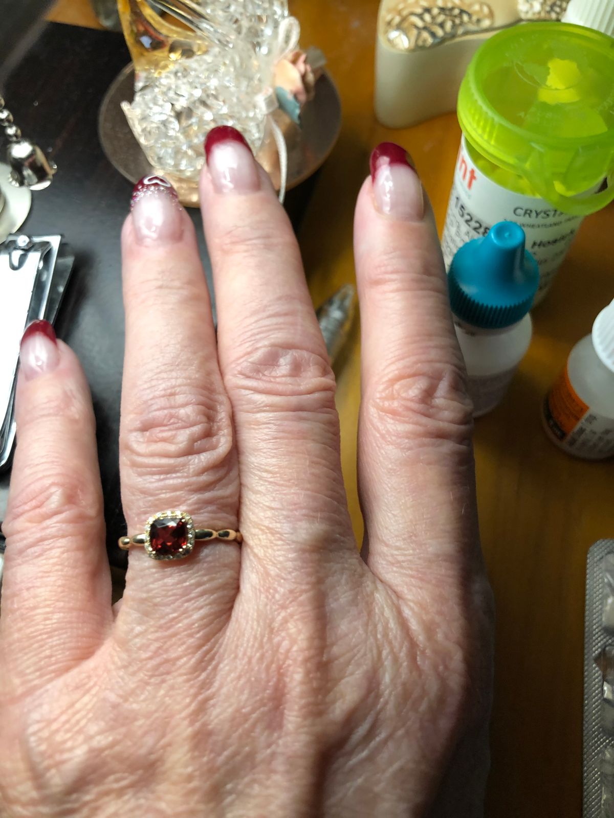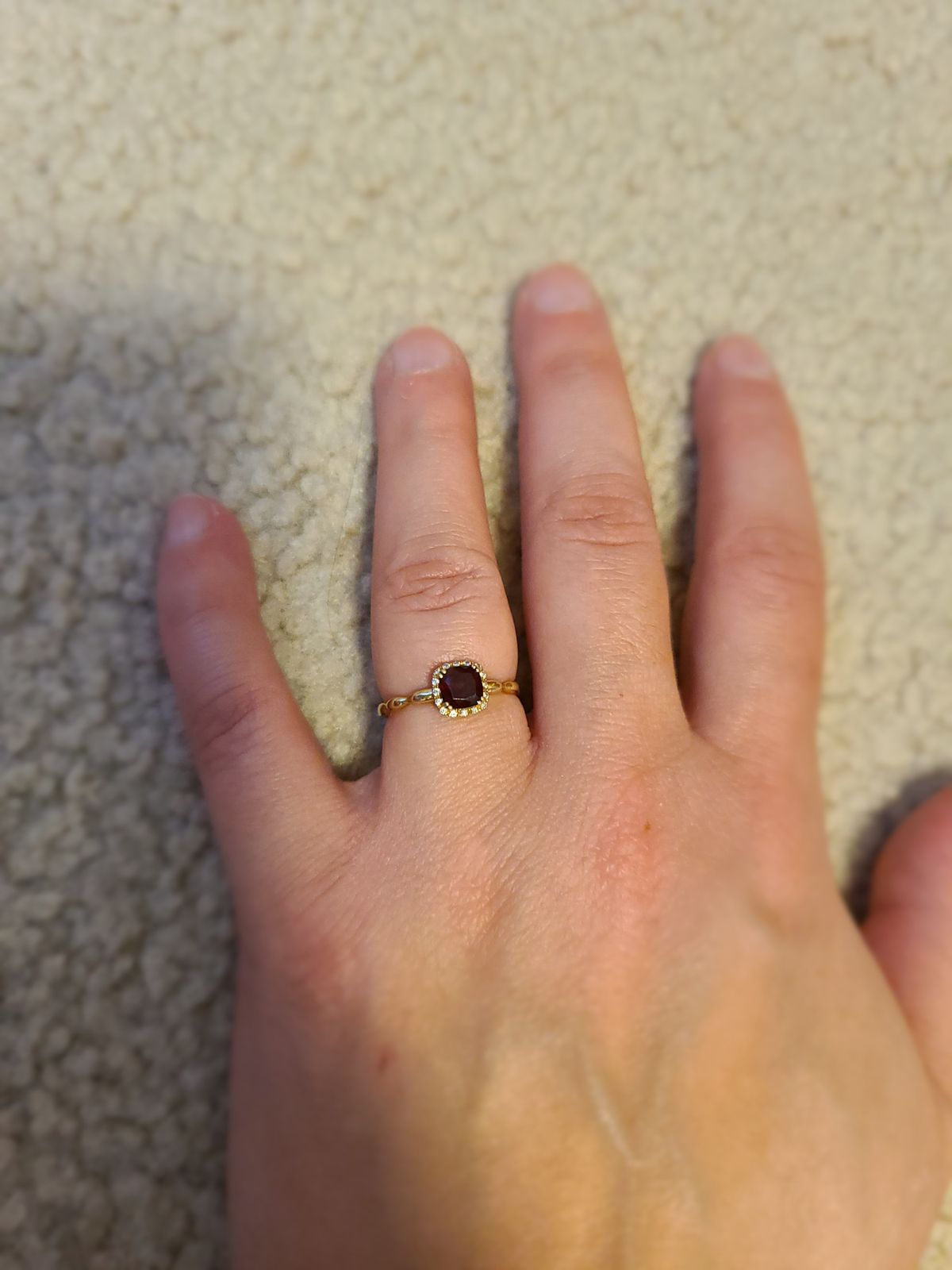 Crafted in 10K yellow gold, this beautiful ring showcases a 5mm cushion shape garnet at its centre and is accented with 16 round diamonds for an extra touch of sparkle. Garnet is January’s birthstone, and this would make for an amazing gift.