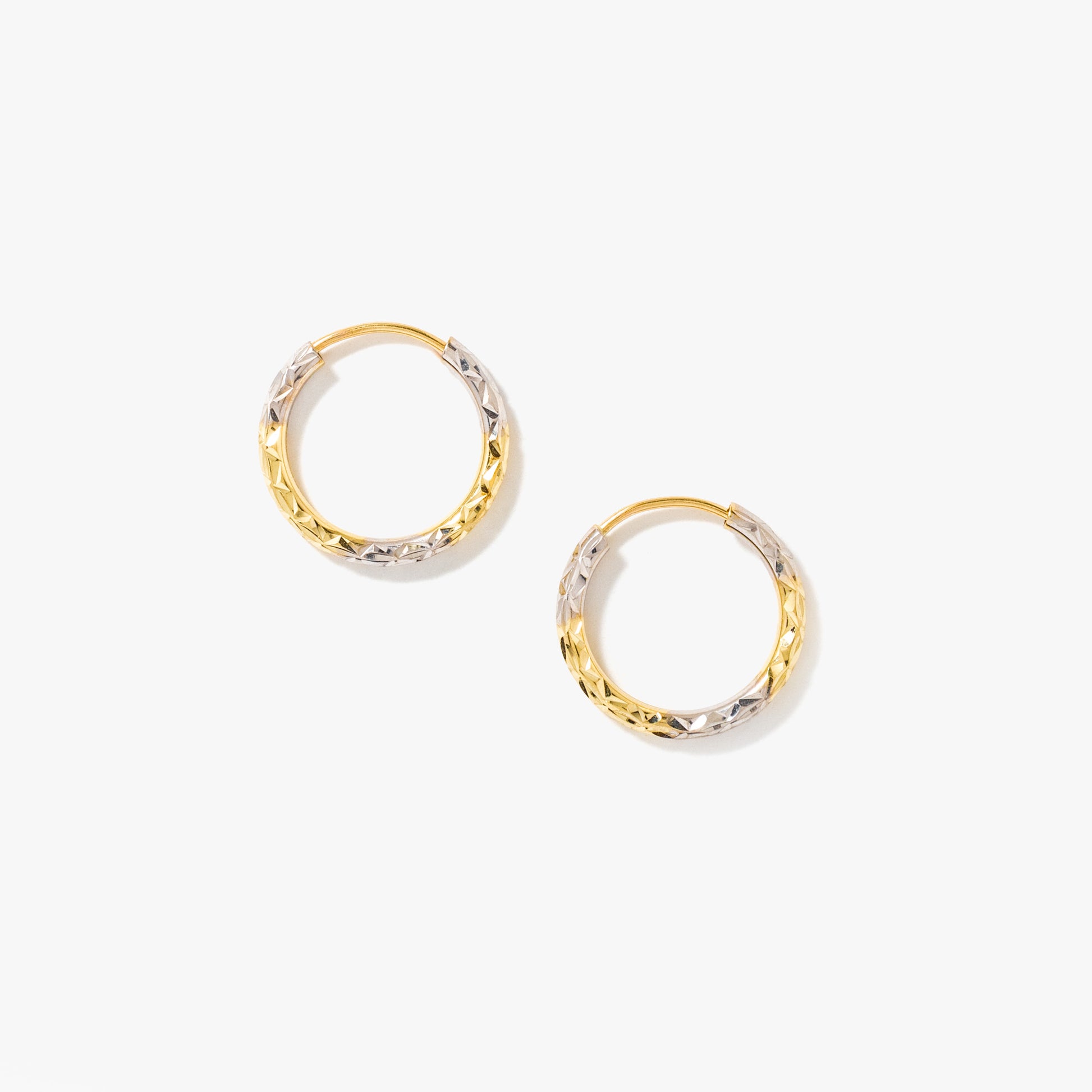 These timeless hoop earrings are a staple for any jewellery collection. Crafted in 10K yellow and white gold, they feature a two-tone diamond-cut design that adds subtle sparkle. Measuring 15mm in length and 1.8mm in depth, they offer classic style with everyday versatility.