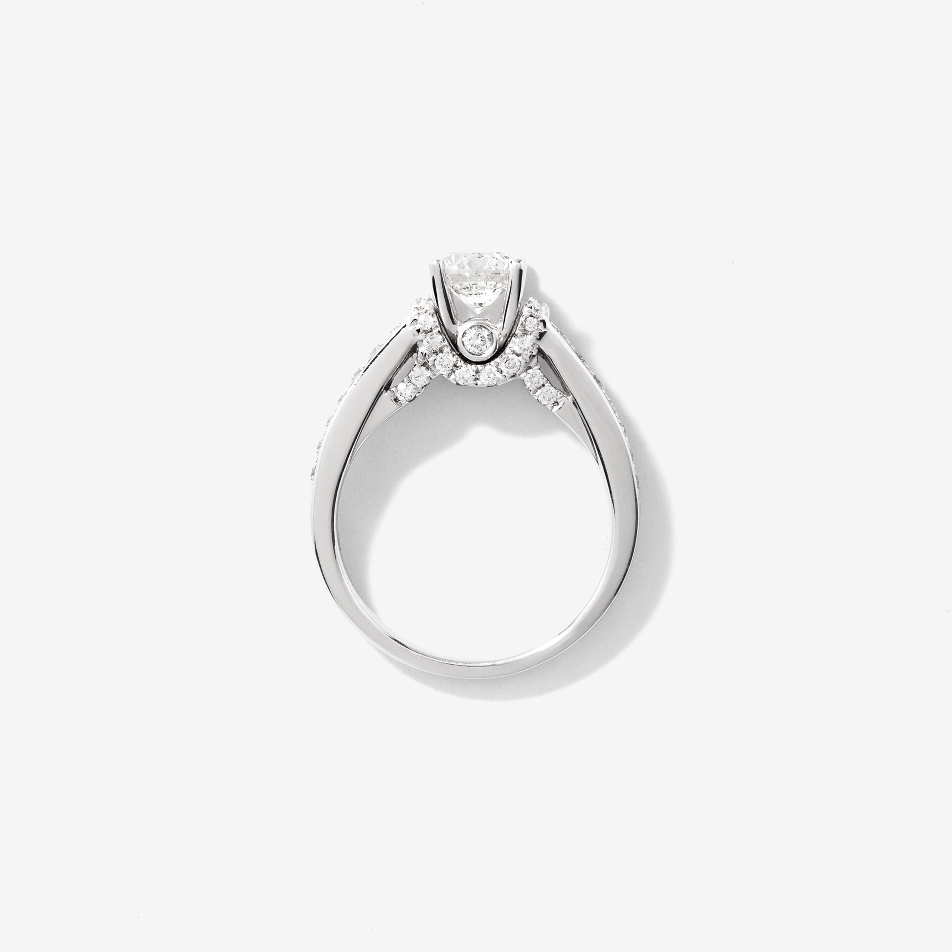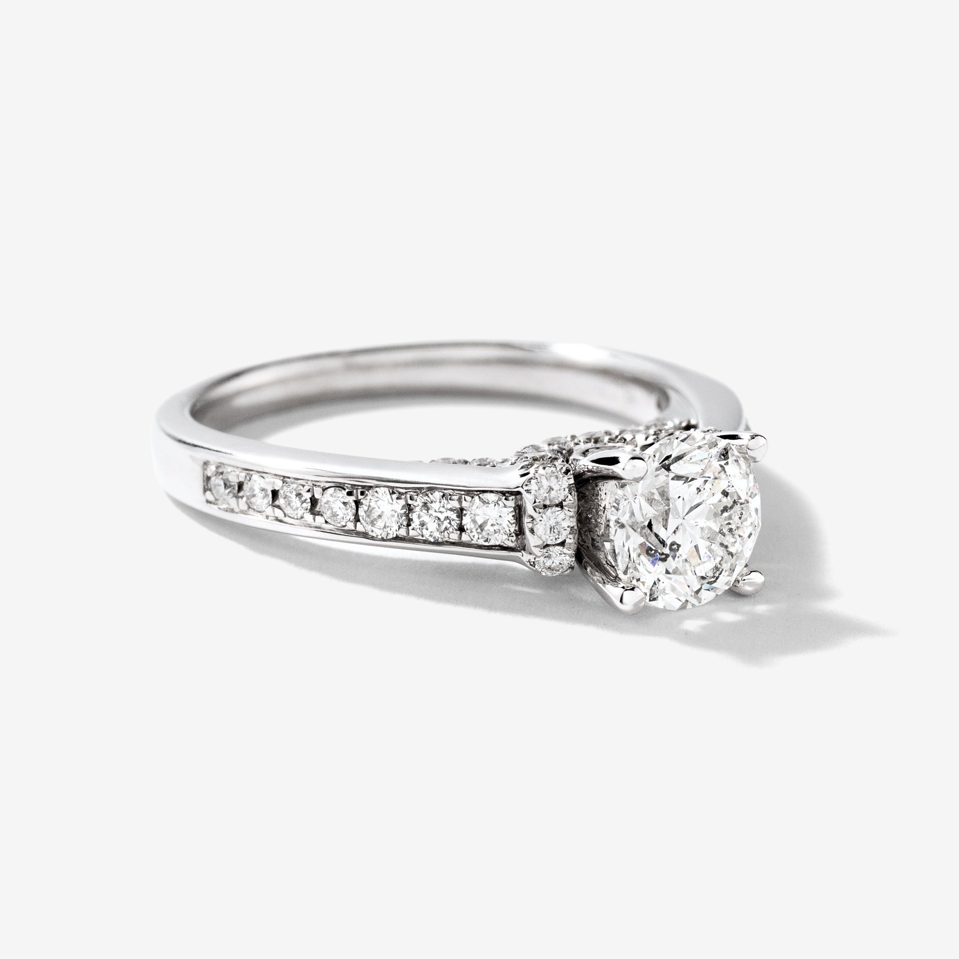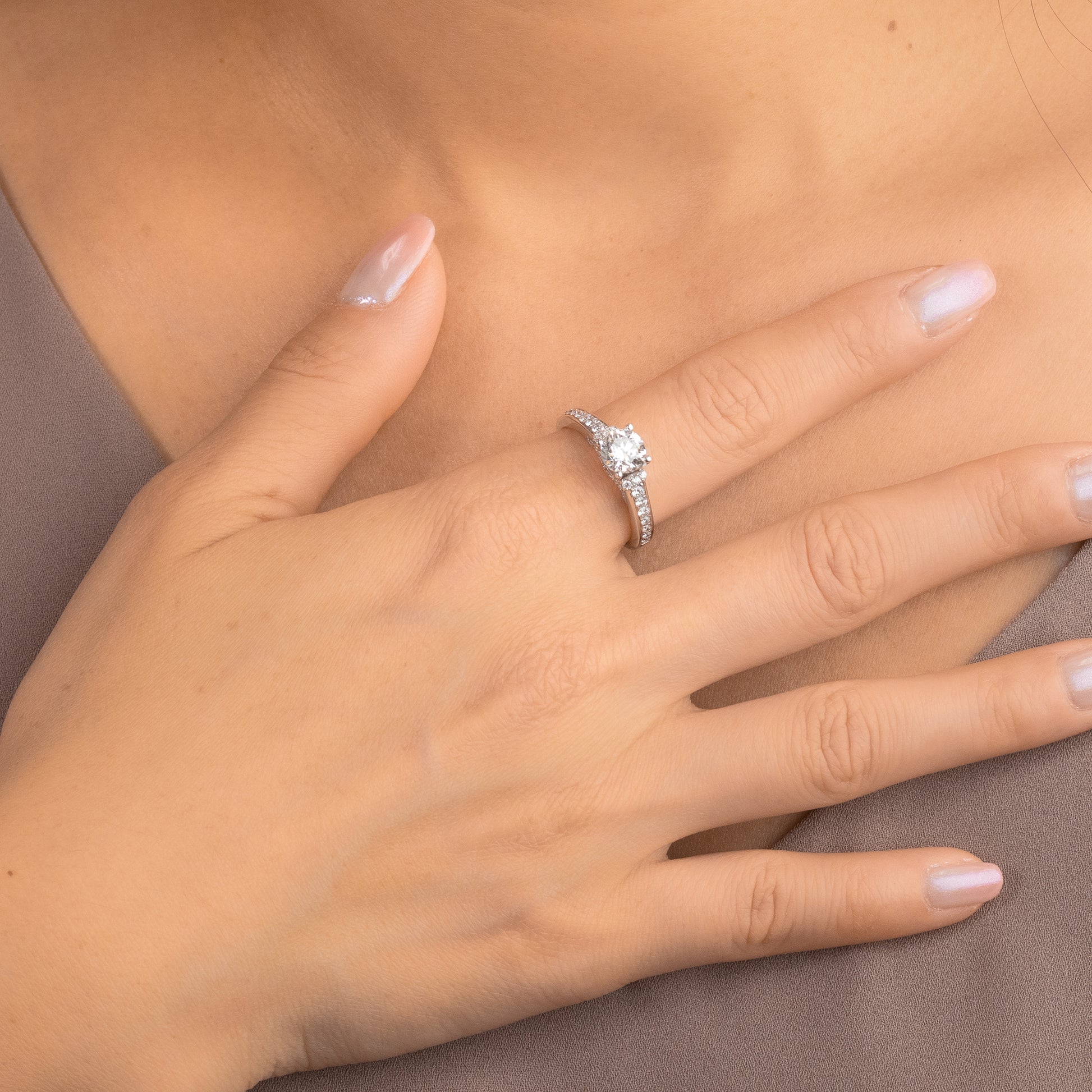 Celebrate your love story with this breathtaking diamond engagement ring. Crafted in 14K white gold, the design centres around a captivating 0.75-carat diamond that radiates timeless elegance. Surrounding it, 46 meticulously set accent diamonds add layers of sparkle and sophistication, bringing the total diamond weight to an impressive 1.32 carats. A dazzling expression of everlasting love, this ring embodies the beauty of your shared journey and the promise of forever.