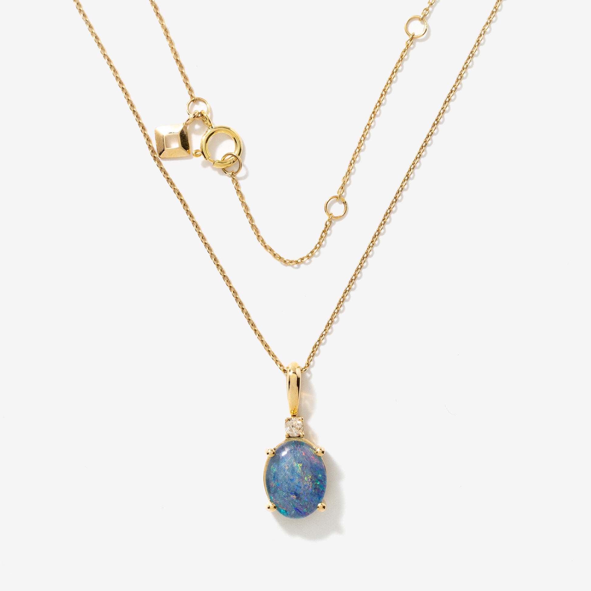 Infuse your style with enchanting colour and individuality. This captivating necklace, crafted in warm 10K yellow gold, features a mesmerizing 10x8mm doublet opal that shimmers with vibrant, ever-changing hues. The adjustable chain includes convenient jump rings, allowing you to wear it at the perfect length for any neckline. Distinctive and artfully designed, this piece is a beautiful way to showcase your unique elegance and personal flair.