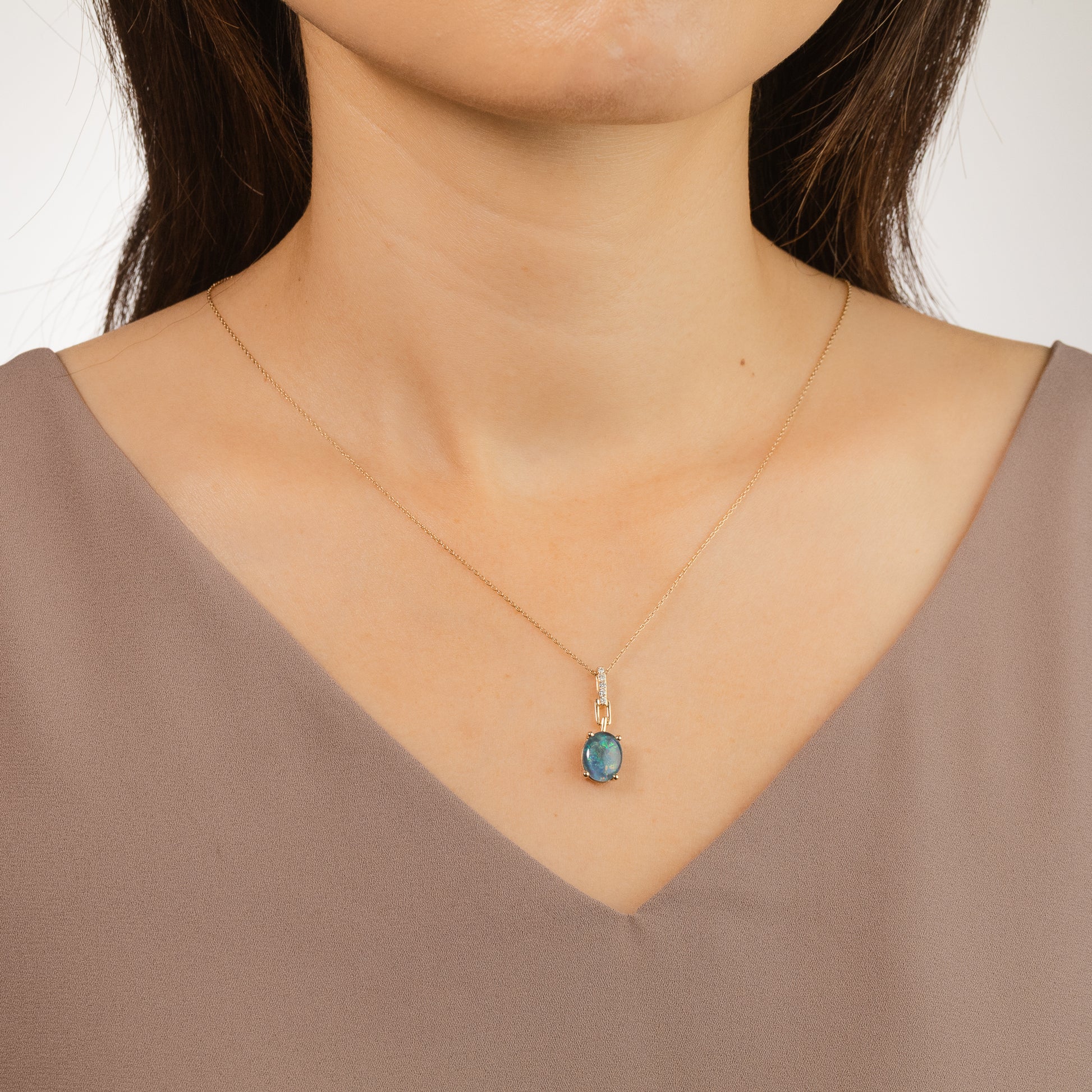 Make a bold style statement with a burst of colour and charm. This striking 10K yellow gold necklace highlights a mesmerizing 10x8mm doublet opal, alive with brilliant flashes that shift with every movement. Its adjustable chain lets you tailor the fit to suit any neckline, offering effortless versatility.