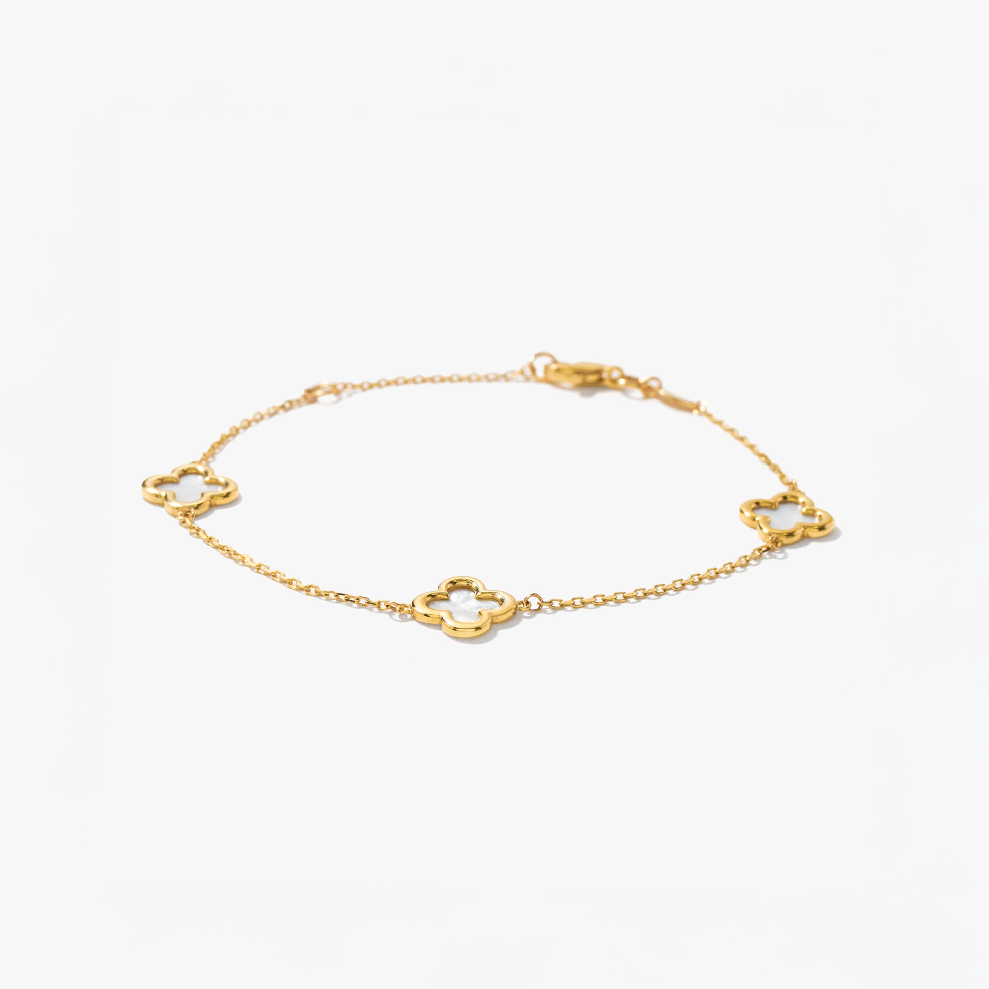 This sophisticated Flower Link Bracelet in 10K yellow gold features delicate flowers accented with luminous mother of pearl inserts. Measuring 7 inches with an adjustable length down to 6 inches, it offers a tailored fit. Its refined design combines elegance with subtle sparkle, perfect for elevating any outfit with timeless grace.