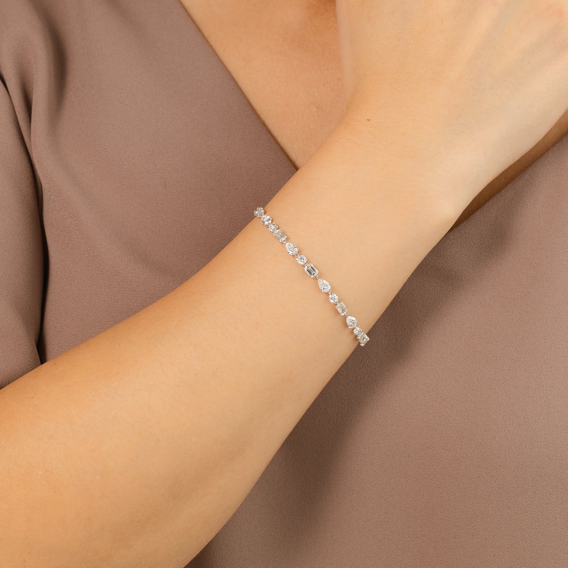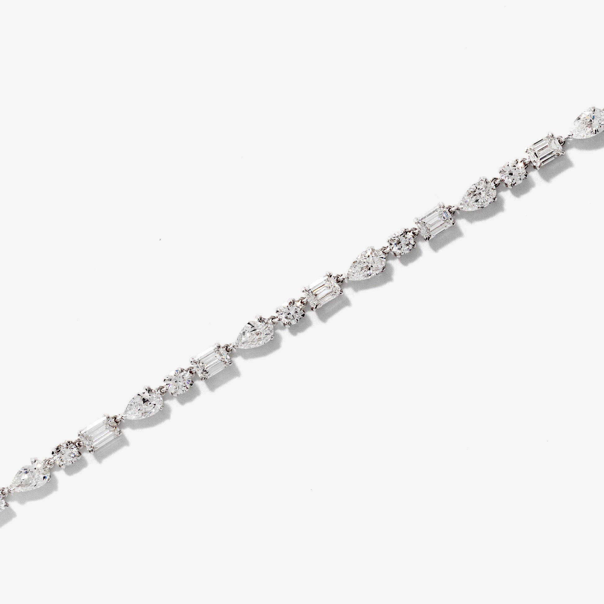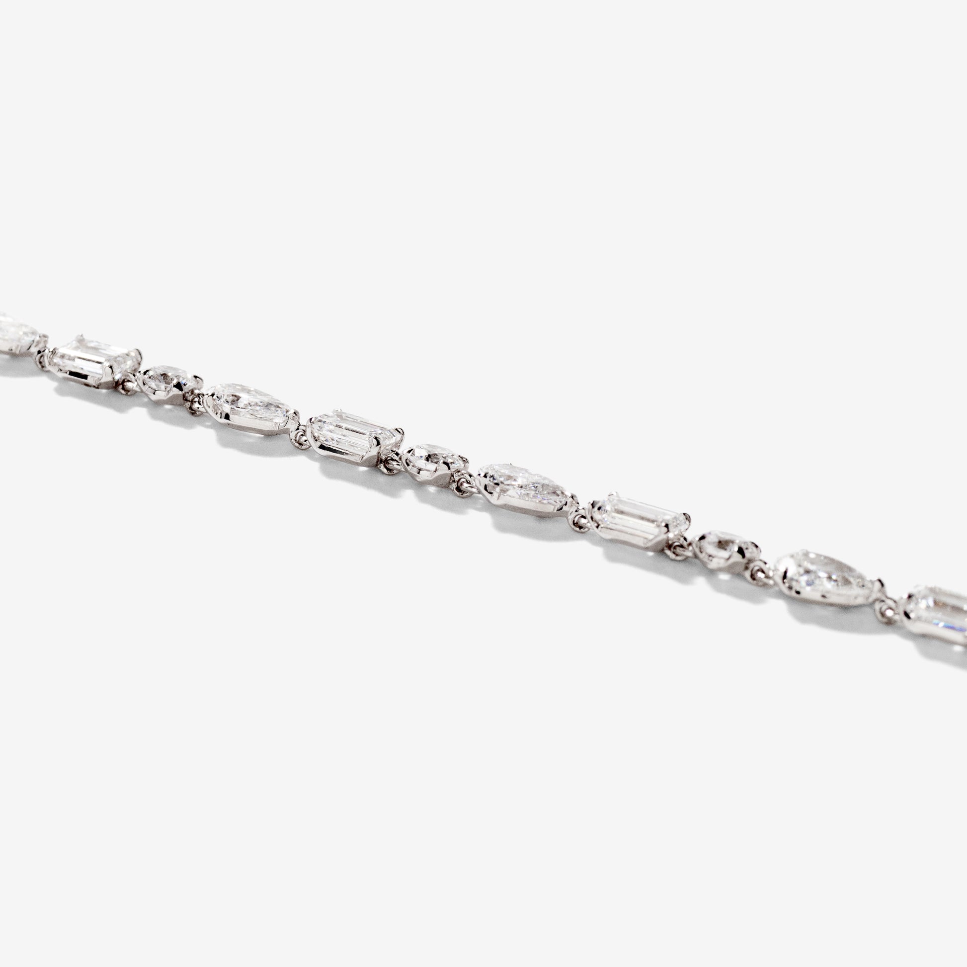 Make a striking statement with this exquisite 7" lab-grown diamond bracelet, beautifully crafted in luminous 14K white gold. Featuring a captivating mix of emerald-cut, round, and pear-shaped diamonds, the design creates elegant contrast and fluid movement along the wrist. Set with a total of 33 lab-grown diamonds, this bracelet has a combined total diamond weight of 5.00 carats. Refined yet bold, this bracelet is a stunning choice for special occasions or an elevated everyday look.