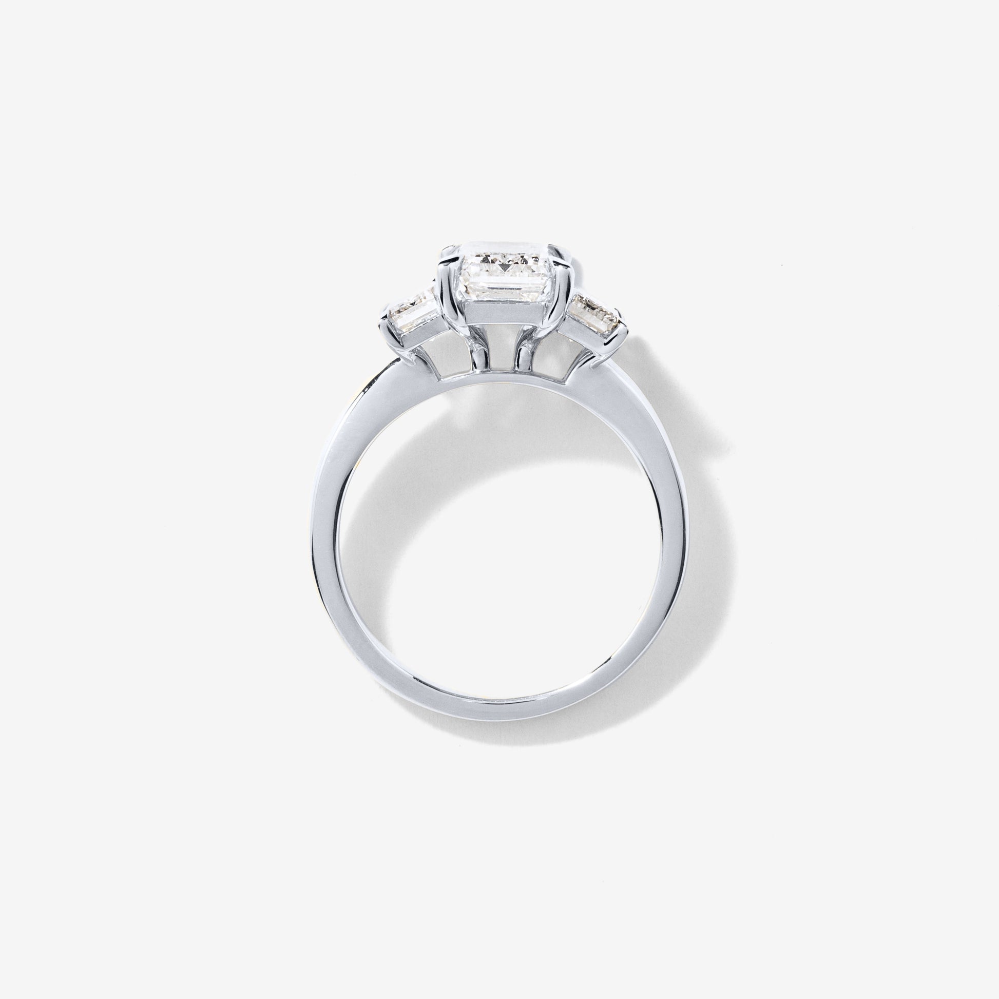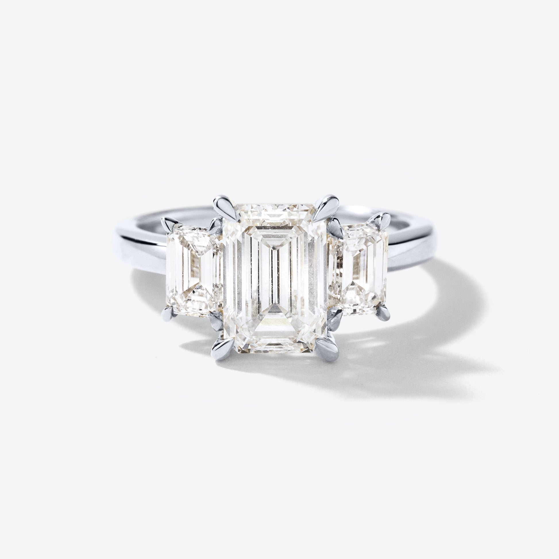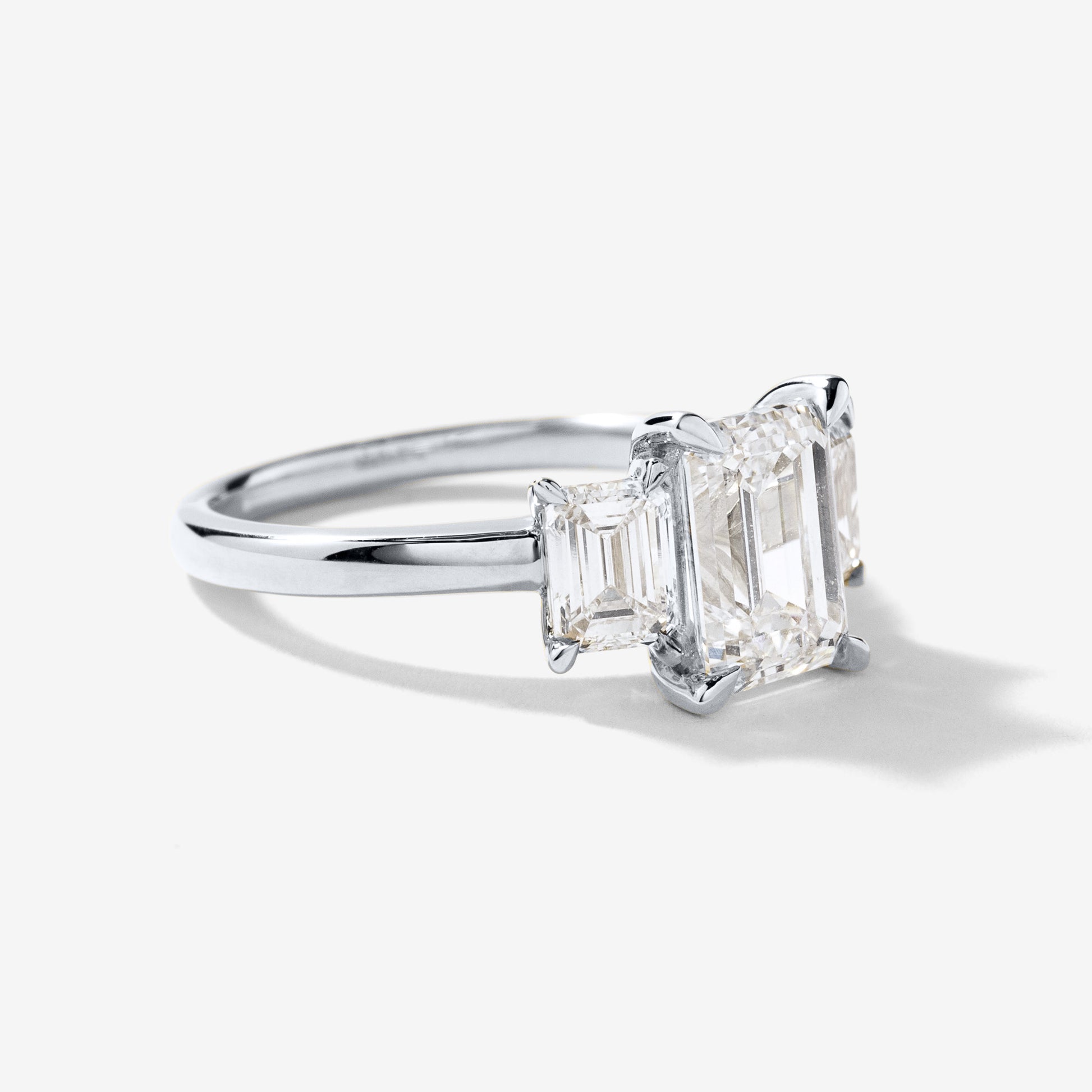 A dazzling tribute to enduring love, this extraordinary three-stone engagement ring commands attention with its breathtaking presence. At its heart, a magnificent 2.00-carat lab-grown diamond captures every glimmer of light with spellbinding brilliance. Flanking it on either side, two perfectly matched 1.00-carat emerald cut diamonds add balance, depth, and radiant harmony. All three diamonds are graded G in color and VS in clarity, ensuring exceptional sparkle and refinement. Set in luminous 14K white gold, this timeless design beautifully symbolizes your past, present, and future.