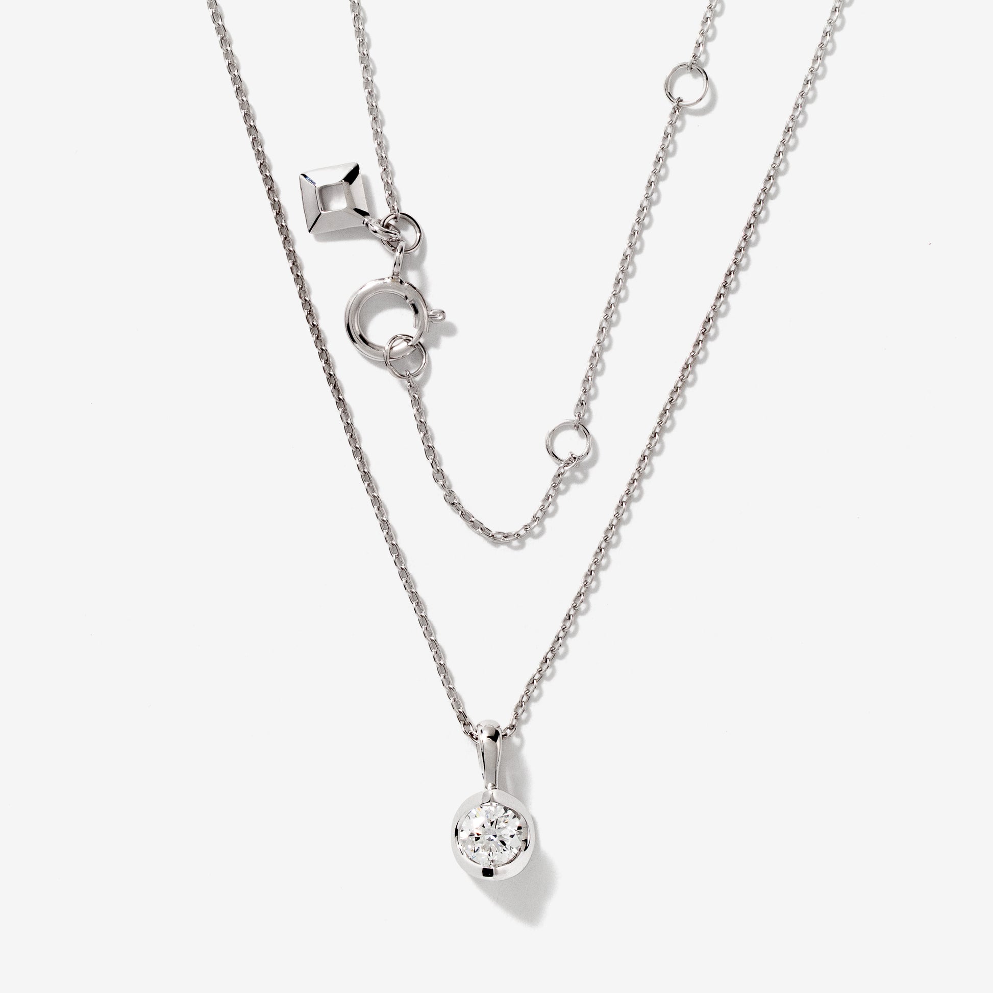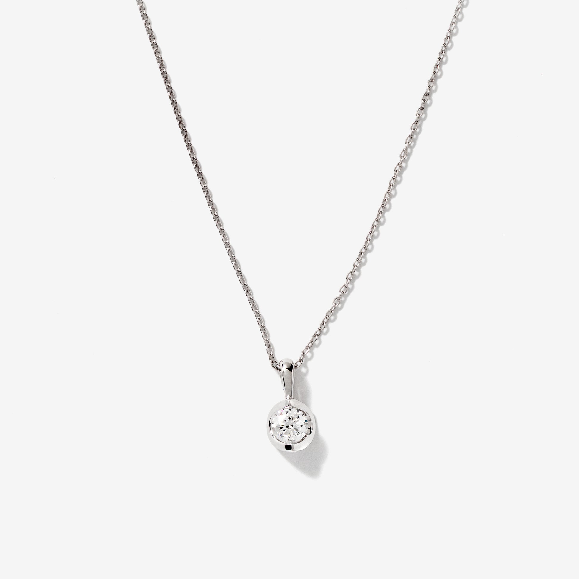 This modern tension-set necklace is crafted in 14K white gold and features a single 0.25-carat round brilliant lab-grown diamond with VS clarity and G colour. The unique faceted setting is designed to catch light from every angle, enhancing the diamond’s radiant sparkle.