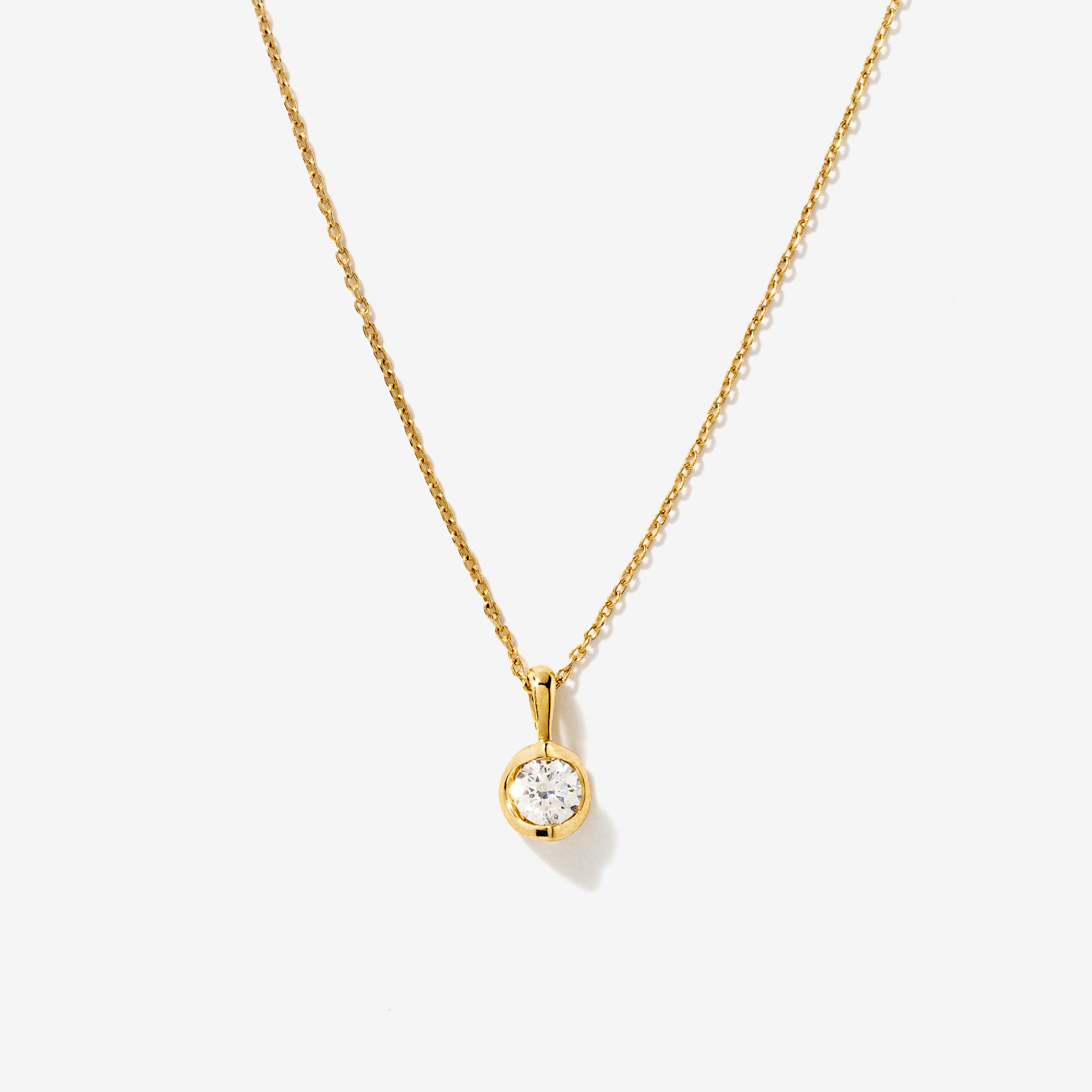This modern tension-set necklace is crafted in 14K yellow gold and features a single 0.25-carat round brilliant lab-grown diamond with VS clarity and G colour. The unique faceted setting is designed to catch light from every angle, enhancing the diamond’s radiant sparkle.