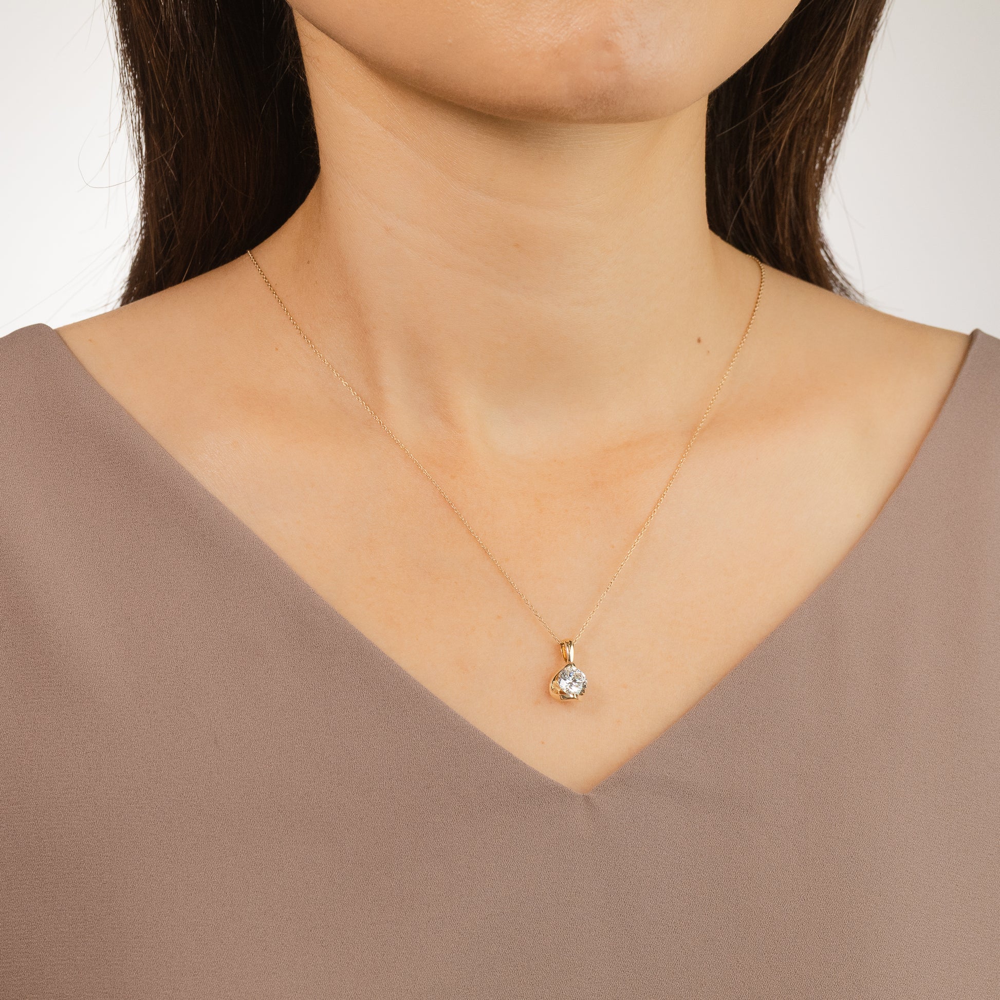 This modern tension-set necklace is crafted in 14K yellow gold and features a single 1.00 carat round brilliant lab-grown diamond with VS clarity and G colour. The unique faceted setting is designed to catch light from every angle, enhancing the diamond’s radiant sparkle.