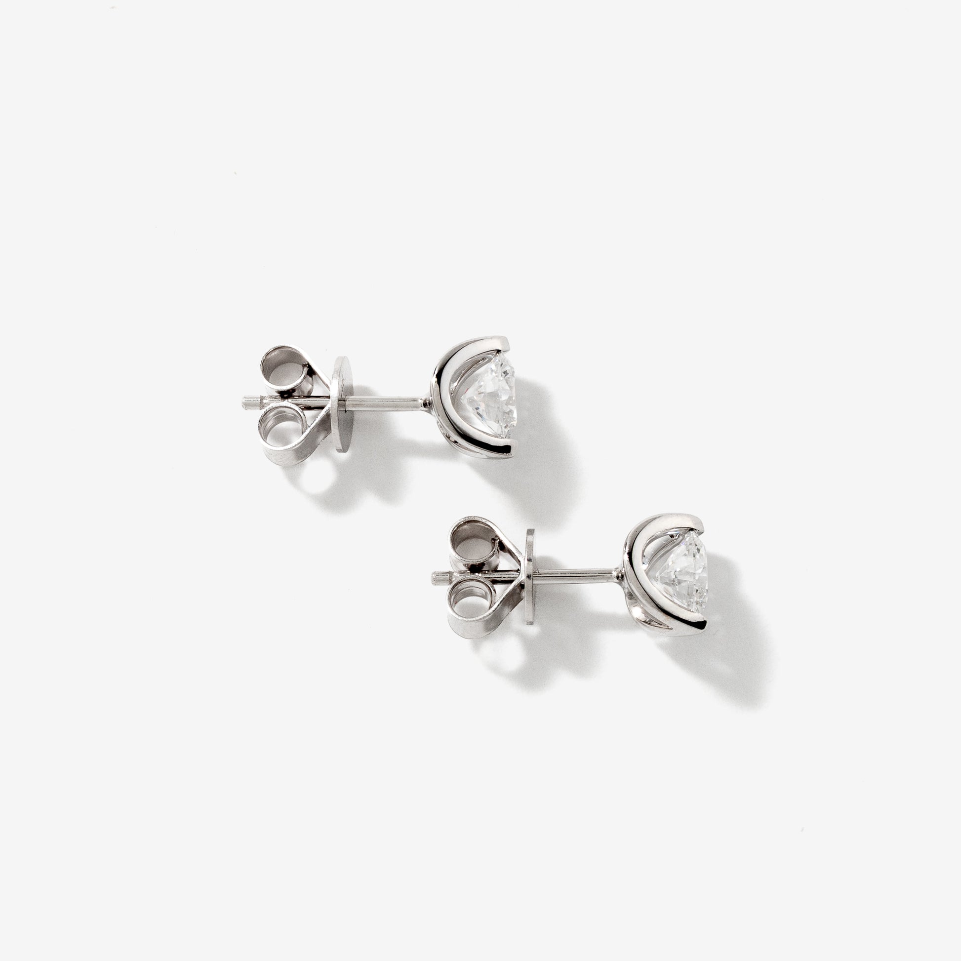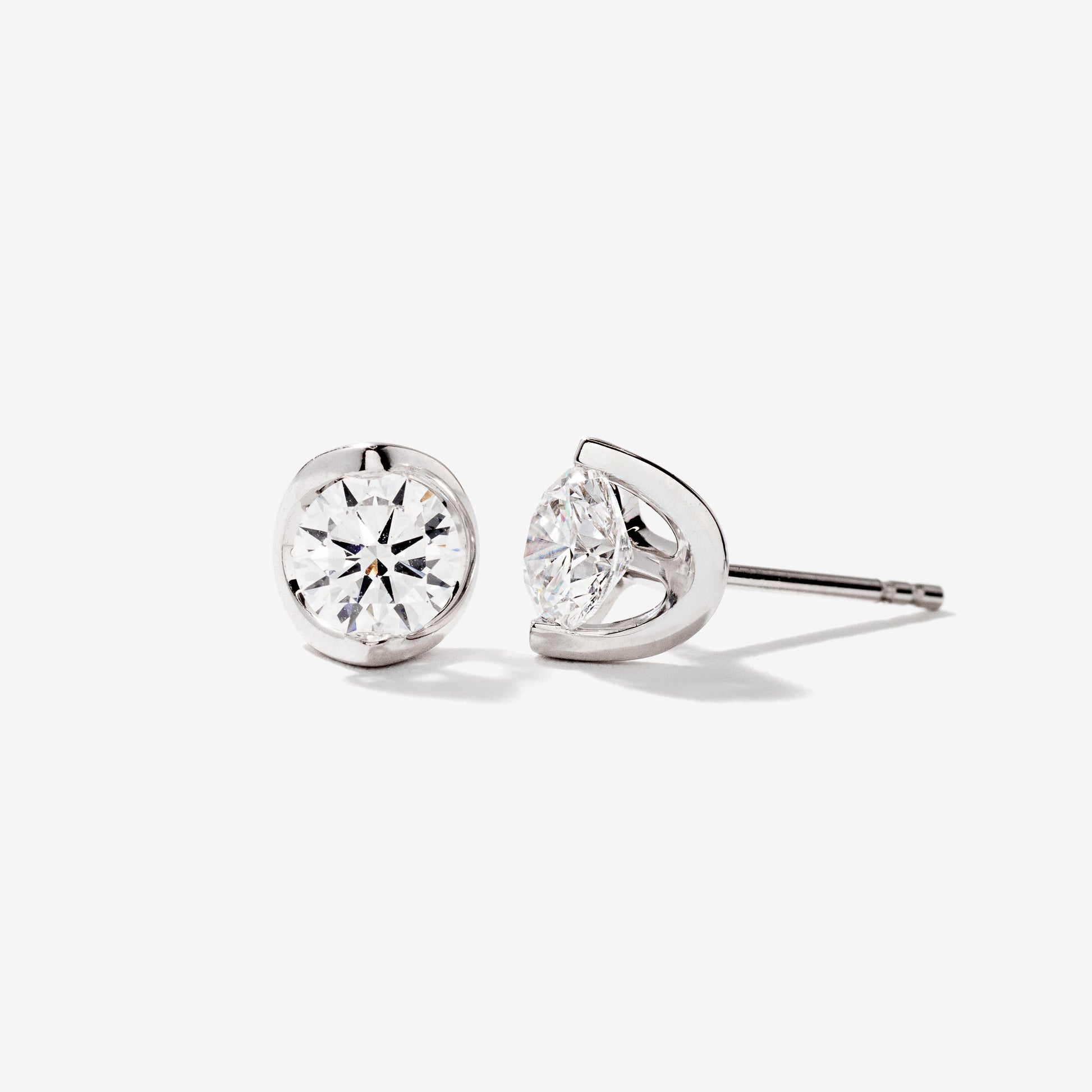 Elevate your everyday style with these modern tension-set solitaire stud earrings, crafted in 14K white gold. Each earring showcases a 0.50-carat round brilliant lab-grown diamond with VS clarity and G colour, for a total diamond weight of 1.00 carats. The unique faceted setting is designed to catch the light from every angle, maximizing each diamond’s brilliance.