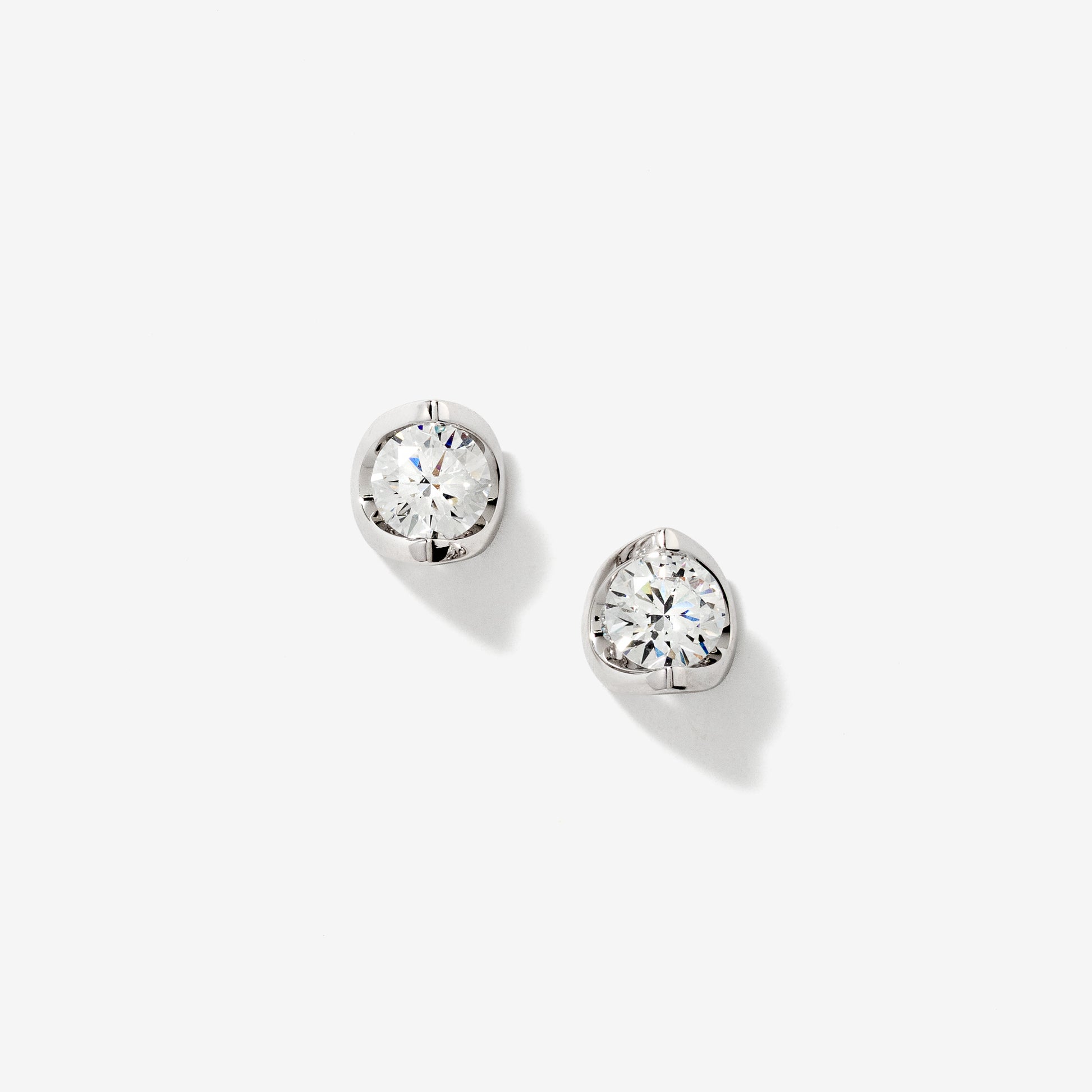 Elevate your everyday style with these modern tension-set solitaire stud earrings, crafted in 14K white gold. Each earring showcases a 0.75-carat round brilliant lab-grown diamond with VS clarity and G colour, for a total diamond weight of 1.50 carats. The unique faceted setting is designed to catch the light from every angle, maximizing each diamond’s brilliance. Timeless and refined, these studs are perfect for both daily wear and special occasions.