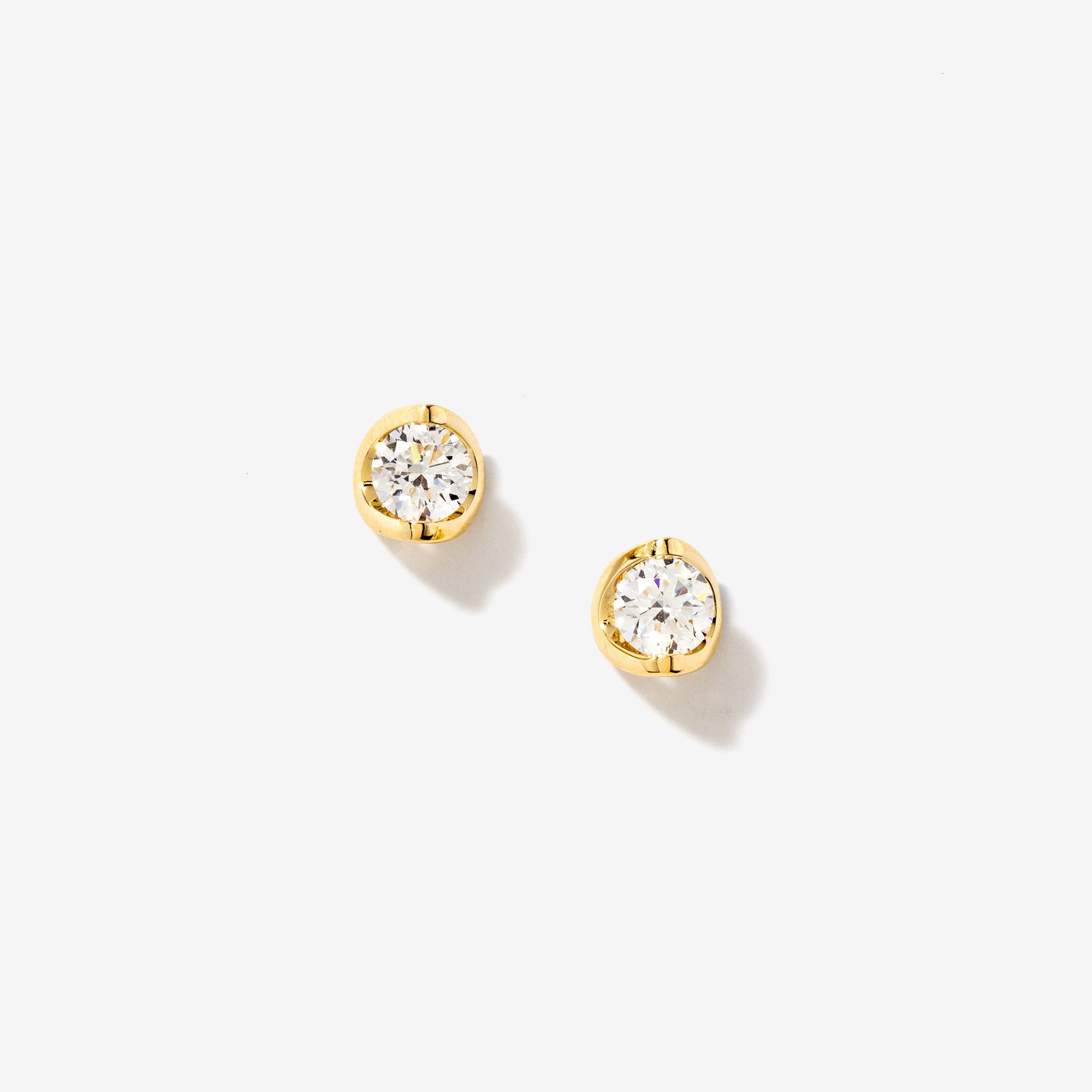 Elevate your everyday style with these modern tension-set solitaire stud earrings, crafted in 14K yellow gold. Each earring showcases a 0.50-carat round brilliant lab-grown diamond with VS clarity and G colour, for a total diamond weight of 1.00 carats. The unique faceted setting is designed to catch the light from every angle, maximizing each diamond’s brilliance.