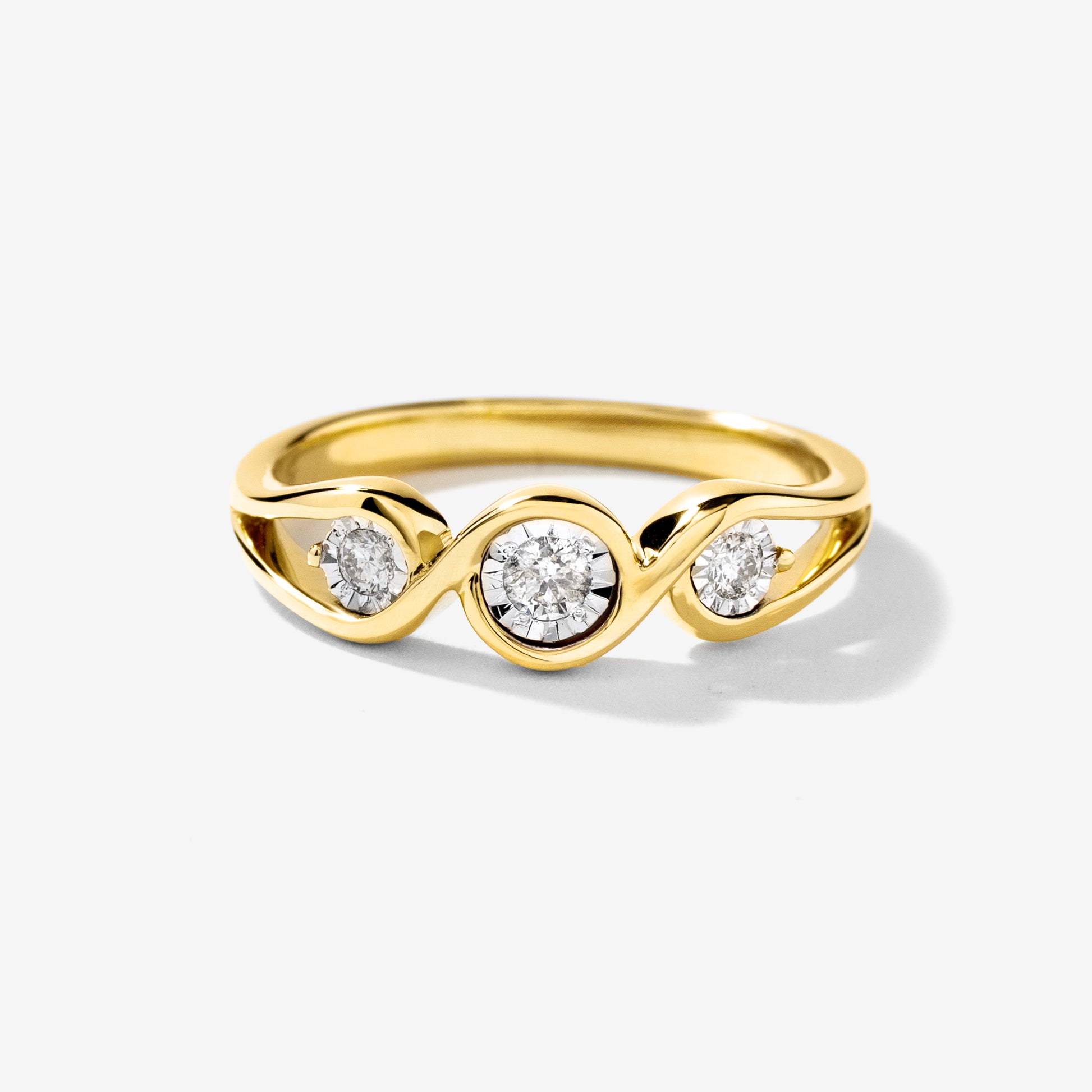 Elegant and timeless, this three-stone diamond ring beautifully symbolizes the past, present, and future of your love story. Crafted with refined simplicity, it features three sparkling diamonds arranged in a classic setting, offering a total diamond weight of 0.13 carats. Delicate yet full of meaning, this ring is perfect as a promise piece, a meaningful gift, or a graceful addition to any jewellery collection.